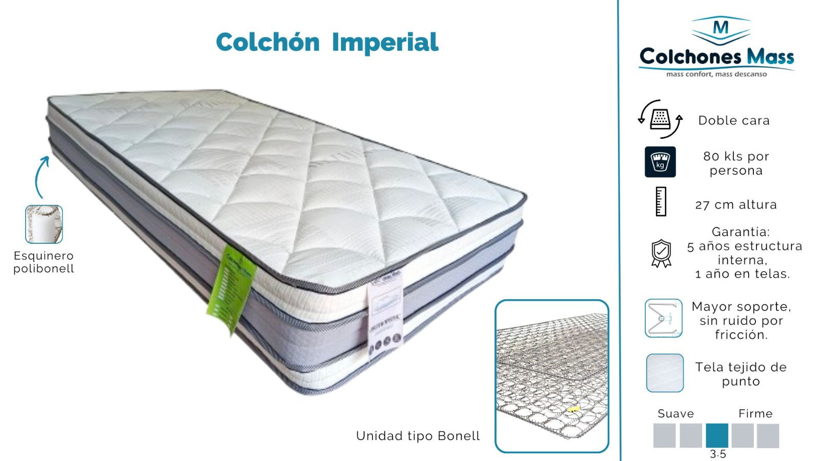 - Colchón Imperial con Doble cara, para 80 kls por persona, con 27 cm altura, 4 años garantia, cuenta con Unidad tipo Bonell y Tela tejido de punto.Su parte interna en resorte tipo Bonell garantiza mayor resistencia y durabilidad del producto, su espuma de alta densidad asegura una distribución uniforme del peso proporcionando el soporte necesario para tu columna vertebral.Su tela Jacquard con tratamiento hipoalergénico es suave y traspirable, brinda confort y frescura.Nuestro colchón IMPERIAL se puede utilizar por las dos caras, esto permite una mejor rotación del producto logrando que todas sus partes se compacten uniformemente.