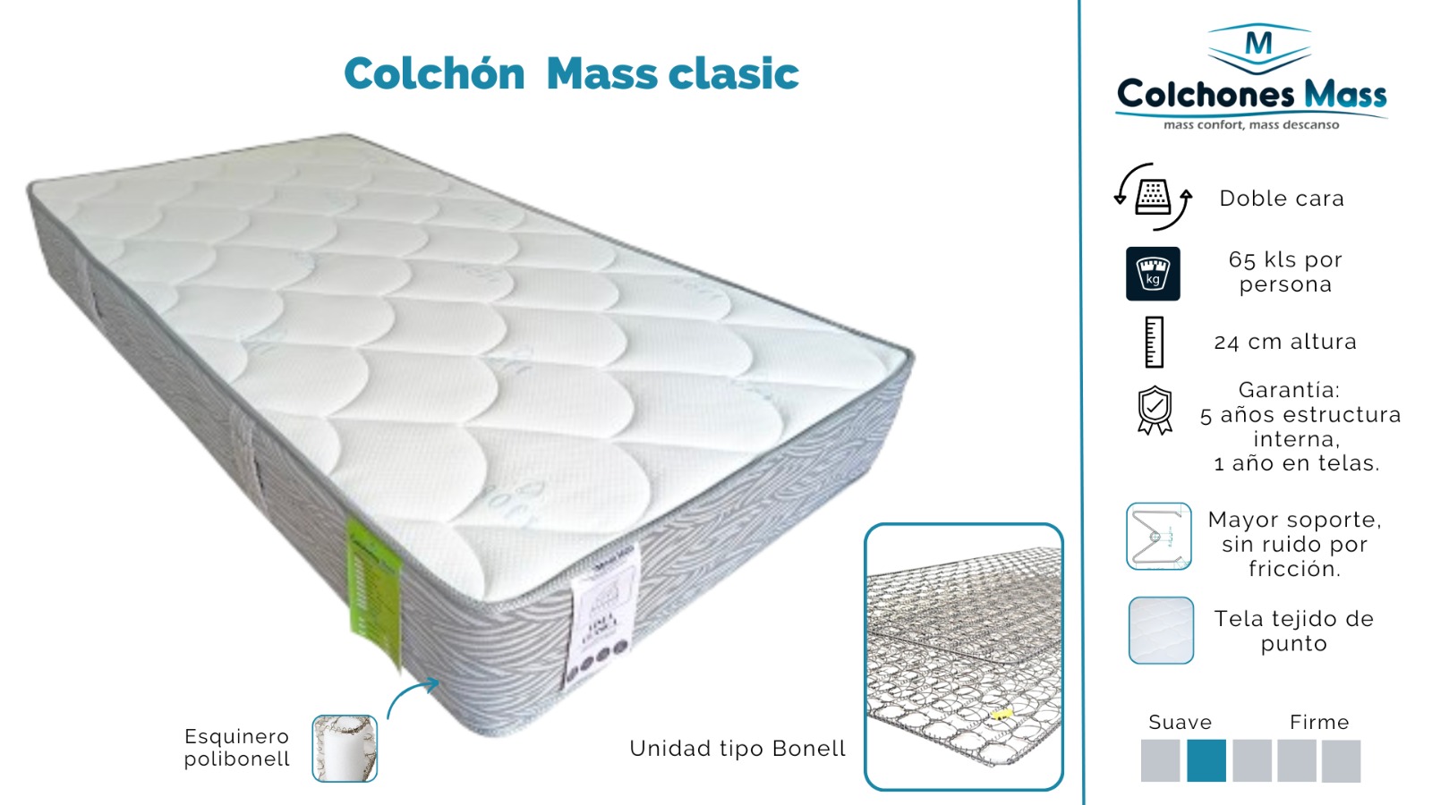 Nuestro colchón Mass Clasic se puede utilizar por las dos caras, esto permite una mejor rotación del producto logrando que todas sus partes se compacten uniformemente.