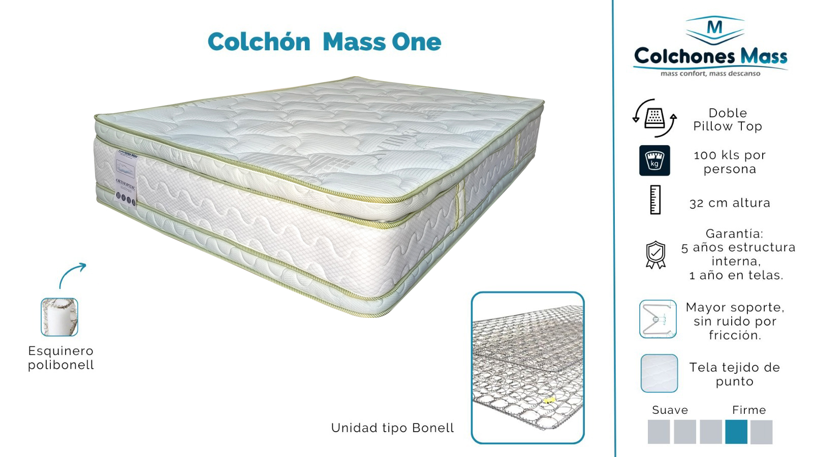 2 .Unidad tipo bonell, compuesta por resortes unidos entre si por hilos de acero que brindan un apoyo uniforme en todo el cuerpo, esta solida estructura asegura un soporte optimo.